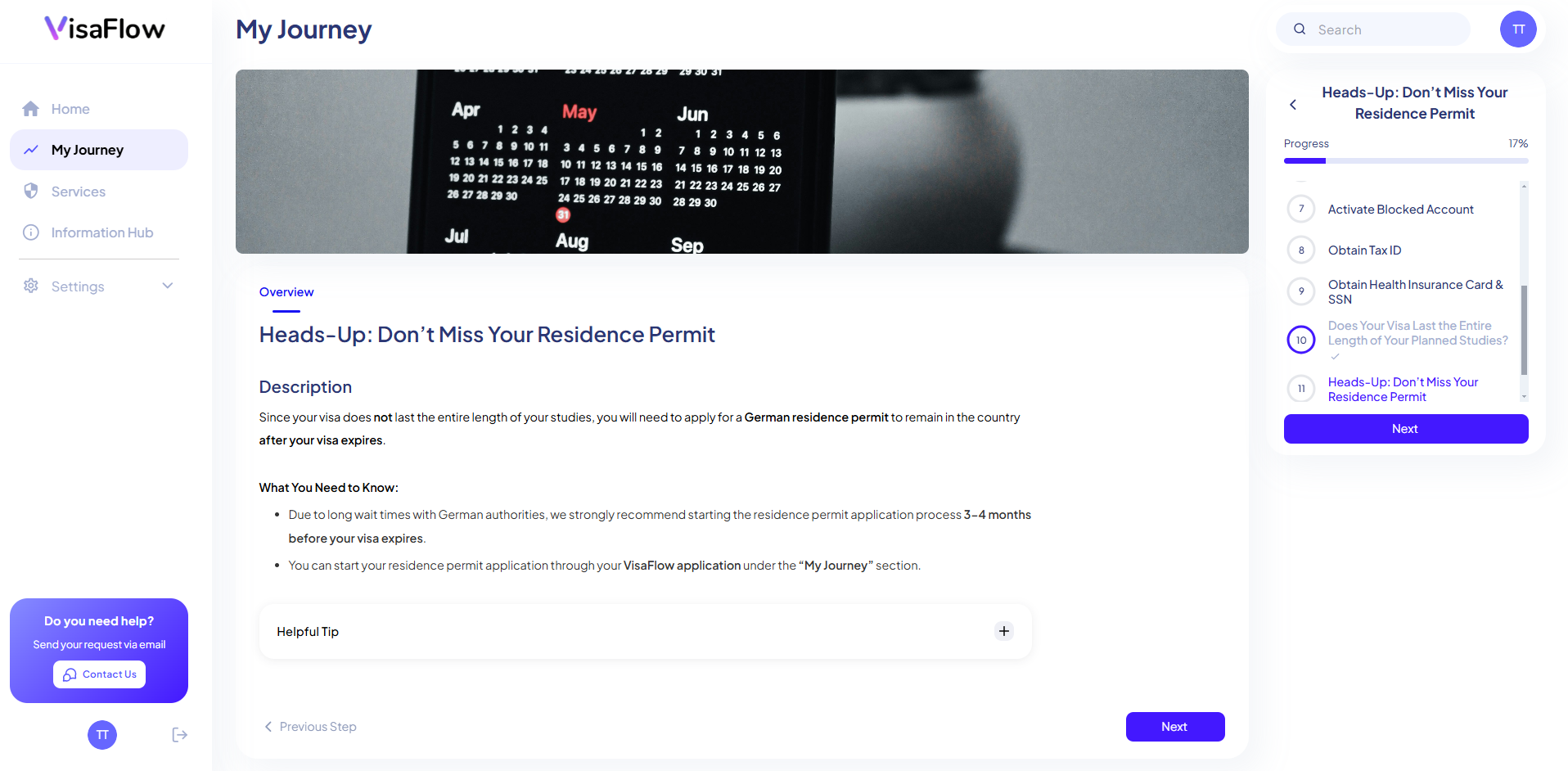 Über einen Zugangscode erstellen sich Ihre Studierenden kostenfrei auf unserer Plattform ein individuelles Nutzerkonto. Nach ihrer Registrierung erhalten sie eine auf ihre Situation zugeschnittene Unterstützung, die sie Schritt für Schritt intuitiv und einfach durch den komplizierten Prozess der Relocation nach Deutschland führt. Sollte es wider Erwarten doch einmal zu Komplikationen kommen, steht unser Customer Support Team Ihren Studierenden mit Rat und Tat zur Seite.